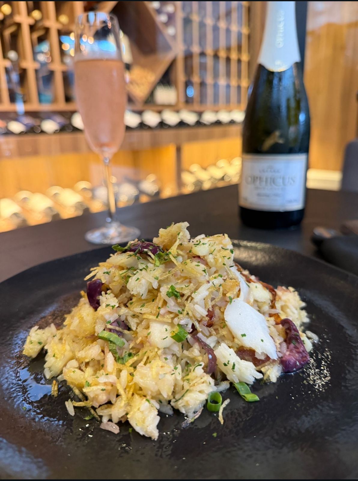 Lombo de bacalhau nobre, cuidadosamente dessalgado, servido sobre um cremoso arroz envolto em um mix especial de queijos. Acompanha azeitonas selecionadas, que realçam o sabor marcante do prato, e finalização com crocante batata palha, proporcionando contraste de texturas em uma experiência única e elegante.