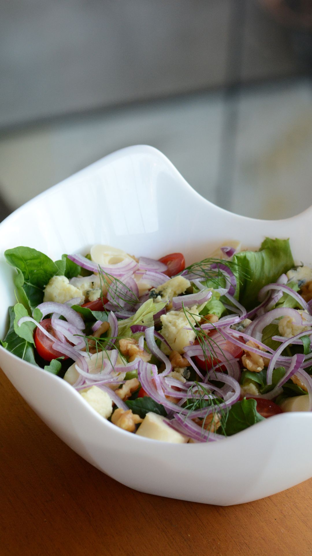 Deliciosa combinação de alface americana, rúcula, tomate pêra, cebola roxa, palmito, noz pecã e gorgonzola, finalizados com citronete de limão e dill.